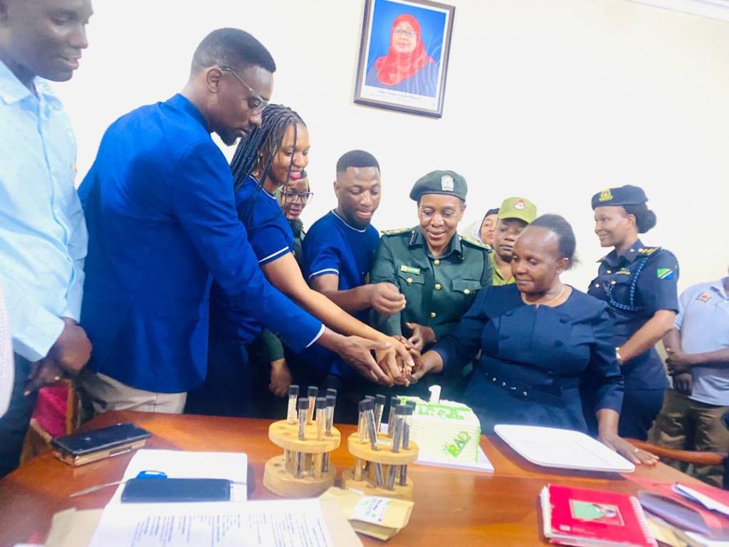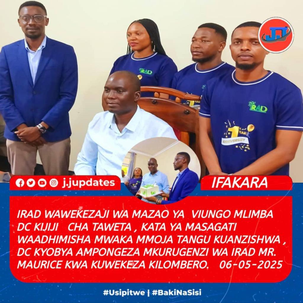 Übersetzt: Das Unternehmen IRAD investiert in Gewürzanbau im Gebiet von Taweta, im Bezirk Masagati, in der Region Mlimba. Mittlerweile feiert man den ersten Geburtstag. Dazu gratuliert Bürgermeister Kyobya dem IRAD-Direktor Maurice Awiti zu diesem Projekt im Rahmen einer Feierstunde in Kilombero.